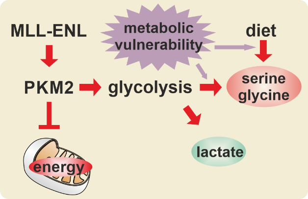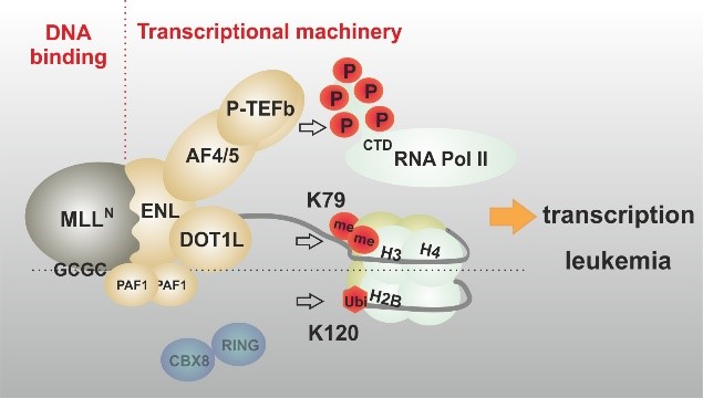 The creation of a MLL fusion protein is the corollary of a chromosomal translocation that fuses the 5’ portion of the gene coding for the histone H3K4 methyltransferase MLL (also called KMT2A) to a wide variety of different partner genes. This creates chimeric proteins that act as untypical transcription factors. MLL fusions recruit parts of the general transcriptional machinery and “lock in” the active status particularly of highly expressed genes. As a consequence, MLL fusions establish a gene expression pattern that evokes self-renewal and aberrant proliferation in hematopoietic precursor cells, eventually leading to an aggressive leukemia. This MLLr (rearranged) disease is prevalent in infants but it also occurs in up to 10% of all acute leukemia diagnosed in older patients. Next to the molecular mechanisms driving the physical activity of MLL fusion proteins, we’re especially interested in the downstream effectors driving cellular transformation and here we also look for alterations of cellular metabolism as malleable “hallmark” of cancer.